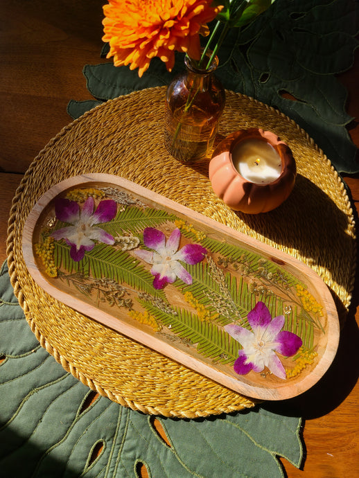 Large Oval Wooden Vintage Orchid Flower Vanity Tray, 14inches x 6 inches, real pressed flower in resin, FDA food safe resin