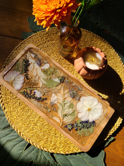 Large Rectangle Wooden Vintage Neutral Flower Vanity Tray, 14inches x 6 inches, real pressed flower in resin, FDA food safe resin