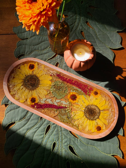 Large Oval Wooden Vintage Sunflower Vanity Tray, 14inches x 6 inches, real pressed flower in resin, FDA food safe resin