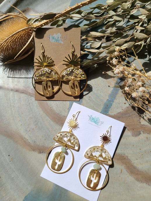 Mountain collection-Sun & Cactus, small white Alyssum flowers, real pressed flower in resin, hammered brass