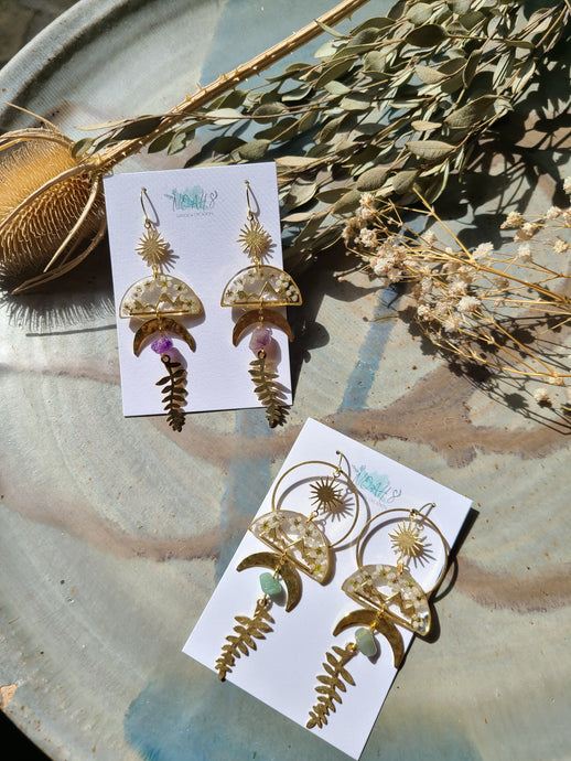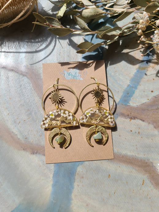 Mountain collection-Sun & Moon, green aventurine crystal, small white Alyssum flowers, real pressed flower in resin, hammered brass