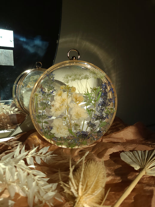 Round Garden Flowers Clutch, resin clutch, removable golden crossbody chain, 7 inches in diameter