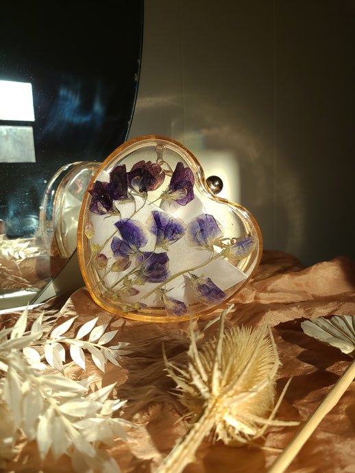 Heart-Shaped Floral clutch, purple sweet pea, resin clutch, removable golden crossbody chain, 6.25 inches x 5.5 inches, white frosty sides