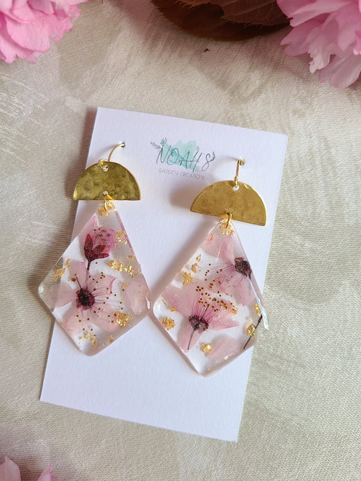 Spring Collection- Blossom dangles, diamond shaped, hammered brass top