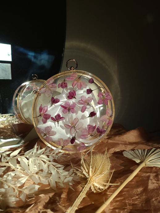 Round Blossom Clutch, resin clutch, removable golden crossbody chain, 7 inches in diameter