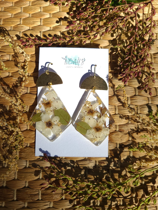 Fall Collection - White Blossom Garden statement dangles, Diamond shape, Hammered brass