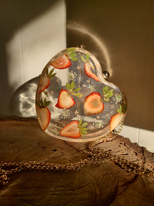 Strawberry Shortcake Heart-Shaped Clutch , resin clutch, removable golden crossbody chain, 6.25 inches x 5.5 inches