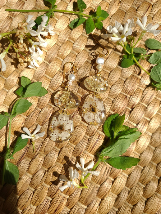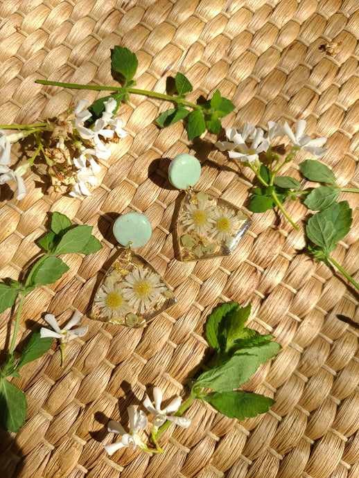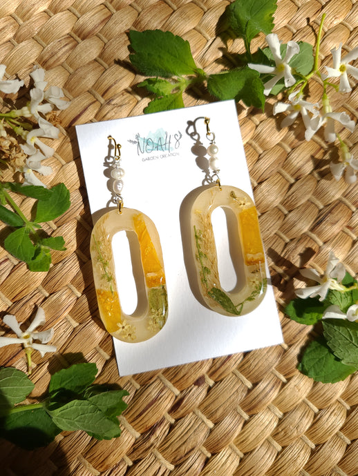 Marigold earrings, real pressed flowers in resin, hammered brass tassel