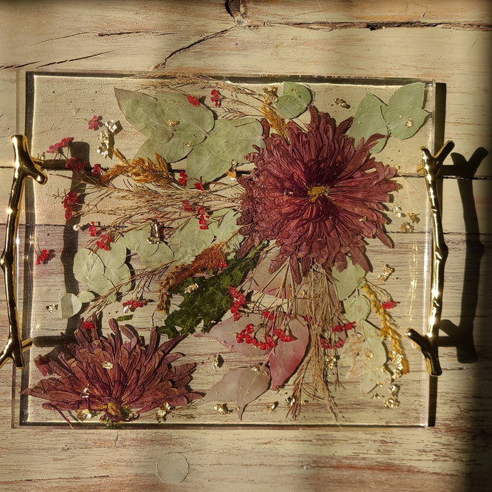 Vintage Red Chrysanthemum Tray, charcuterie board,12 inches x 10 inches, metal twig handle, made with FDA food safe resin