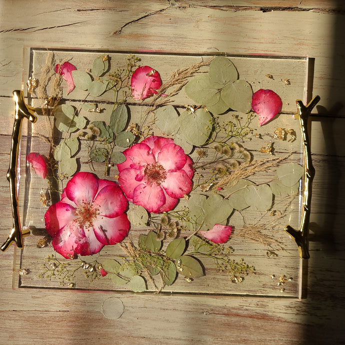 Rose Tray, charcuterie board,12 inches x 10 inches, metal twig handle, made with FDA food safe resin