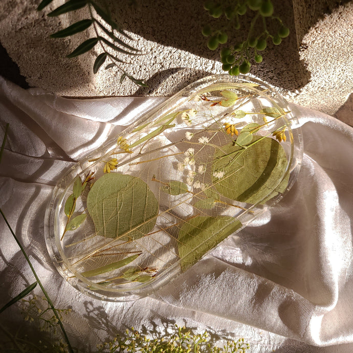 Eucalyptus Vanity Tray, 7 inches x 3.75 inches, real pressed flower in resin, FDA food safe resin
