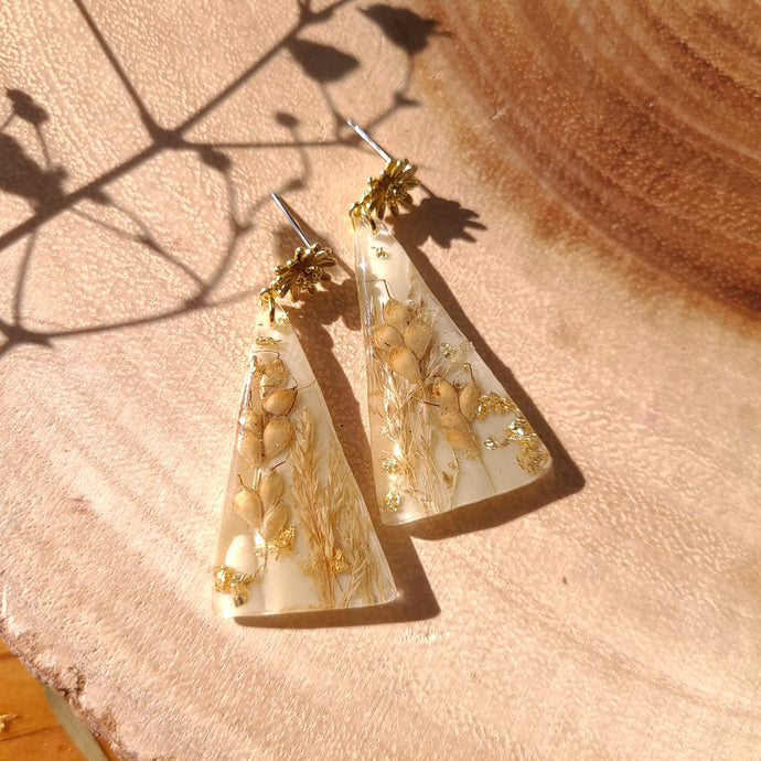 Golden wheat earrings, real pressed flower in resin, little daisy stainless steel post